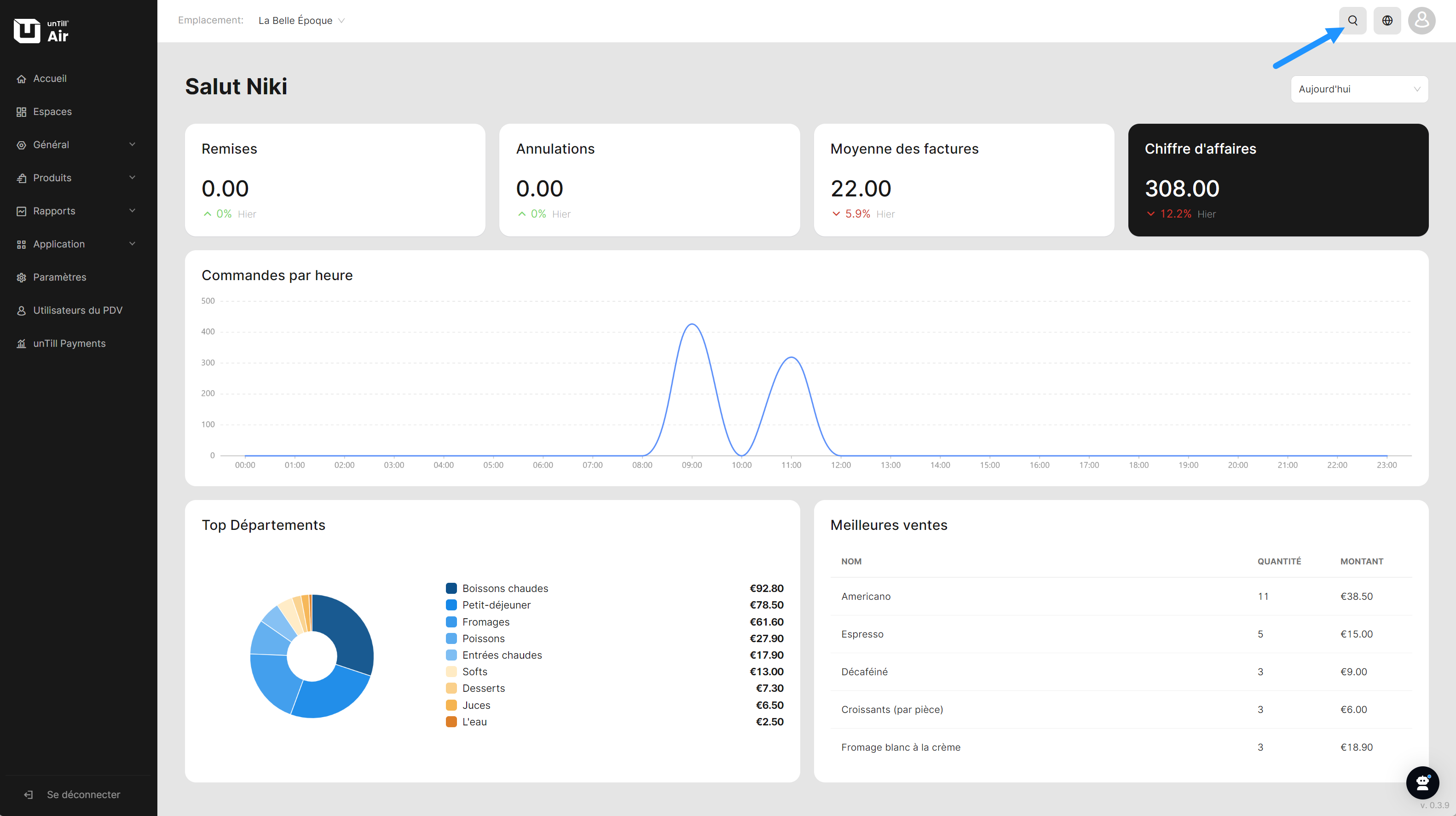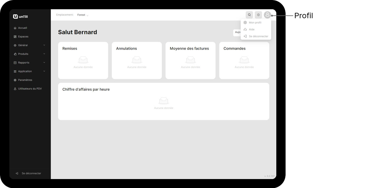 Votre profil, avec des détails sur les abonnements, les emplacements et la page 'Besoin d'aide ?' avec les coordonnées de votre revendeur ou de votre représentant unTill, n'est qu'à un clic de distance. Appuyez sur l'icône de profil en haut à droite. Cela vous donnera accès à toutes ces informations importantes en un seul endroit.