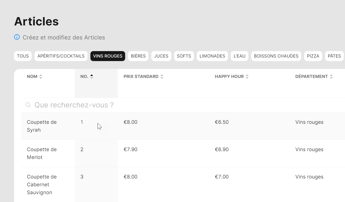 Pour modifier des articles ou tout autre élément dans le Back Office, vous pouvez double-cliquer sur la ligne de l'élément que vous souhaitez modifier et effectuer toutes les modifications nécessaires.