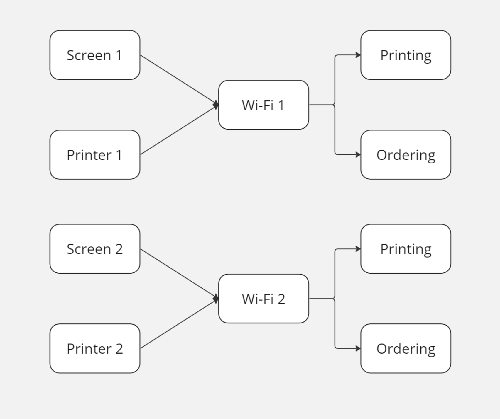 To address this issue, split your location into a few zones and set up different devices (screens and printers) in each zone. By grouping your screens and printers by area, you will avoid connection problems and ensure consistent printing, as this approach keeps them connected to the same Wi-Fi network.