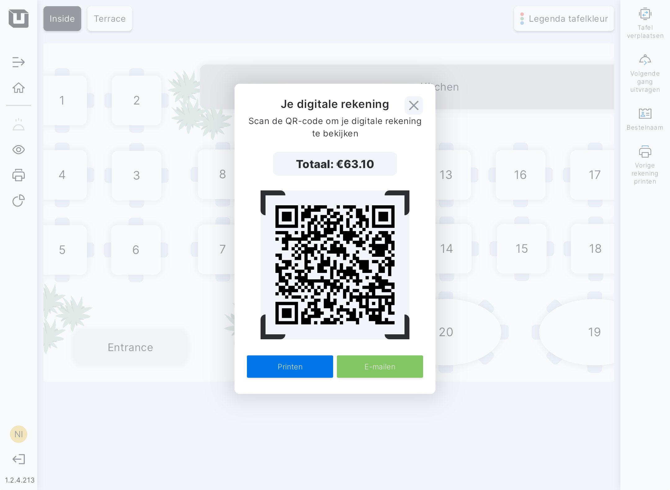 Wanneer je digitale rekeningen aan je klanten verstrekt, verschijnt er een pop-up met een QR-code en een e-mailoptie telkens wanneer je de betaling afrondt in de kassa voor de hele rekening of een deel ervan, zoals in het geval van een gesplitste betaling.