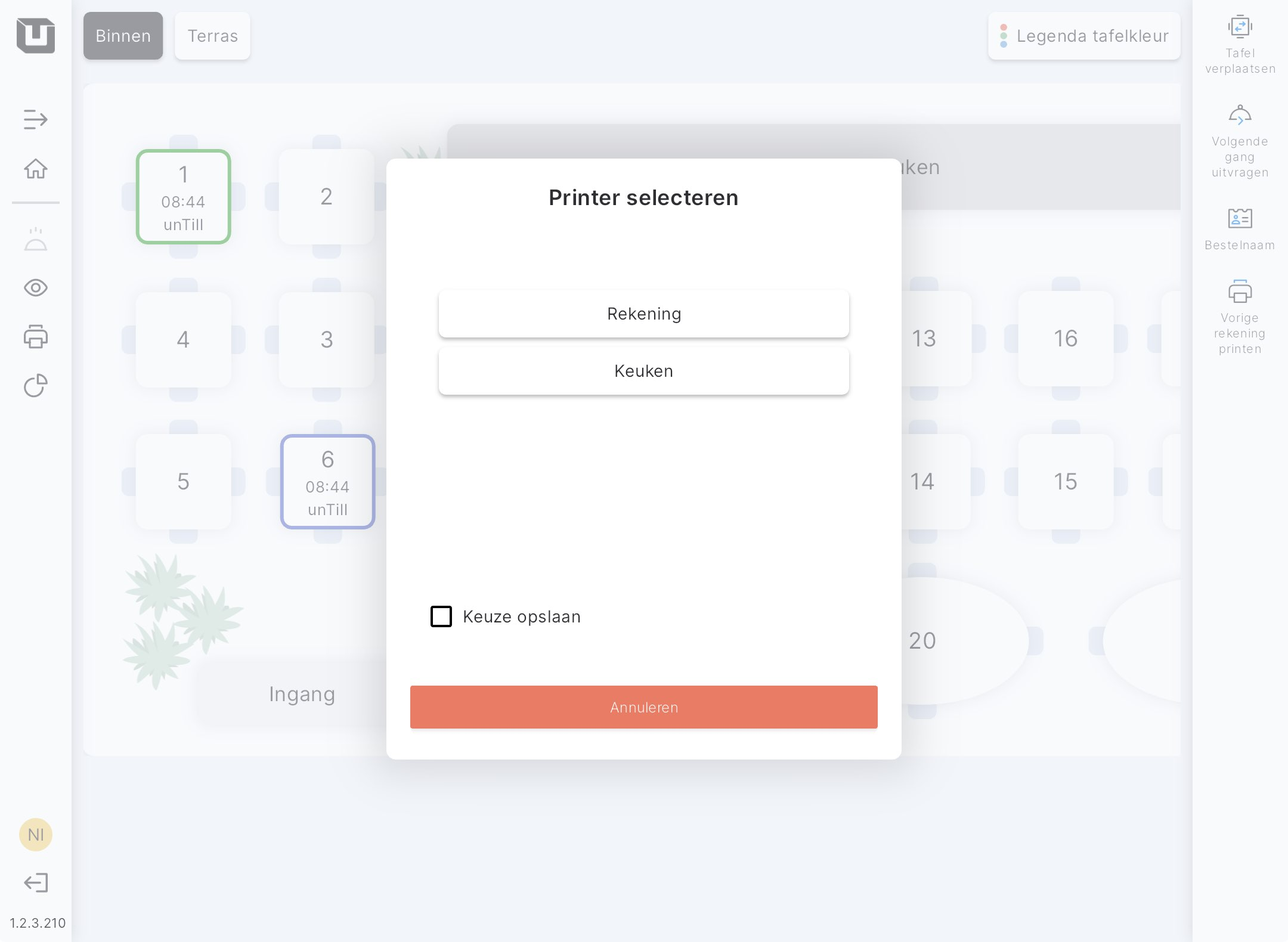Als je maar één rekeningprinter hebt toegevoegd, worden de kaartjes op die printer uitgegeven, maar als je meerdere rekeningprinters in de Back Office hebt, wordt je gevraagd om de printer te selecteren waarop je de rekening wilt afdrukken.