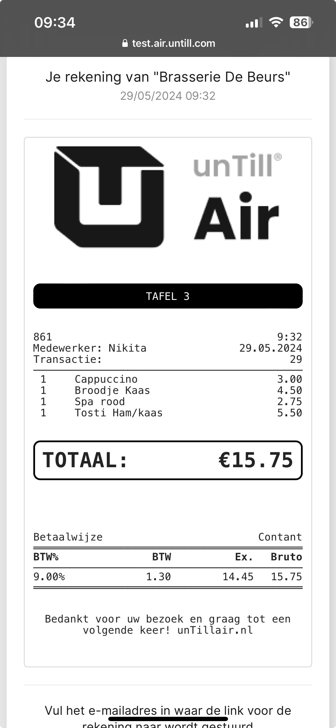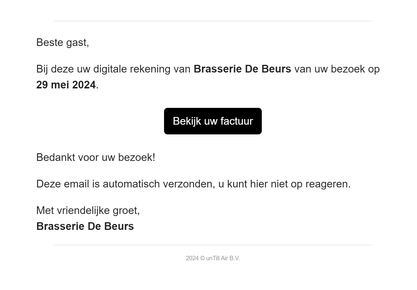 Met unTill Air kun je rekeningen elektronisch afleveren bij klanten op het Point-of-Sale, zonder geprinte kopieën. Een rekening naar klanten sturen kan via een QR-code door deze te scannen en de rekening op een browserpagina te bekijken, of door deze per e-mail naar de inbox van de klant te sturen.
