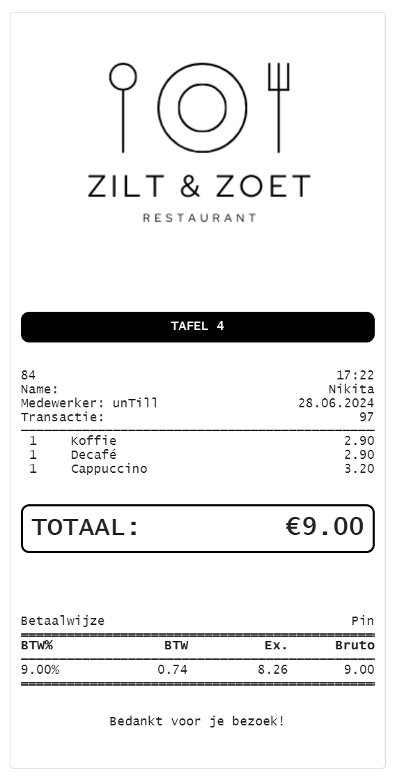 Onder dit gedeelte kun je het totaalbedrag en de gebruikte betaalmethode in de transactie zien. Vervolgens is het laatste gedeelte van het bonnetje de BTW. Hier kun je de berekende BTW voor deze rekening zien.