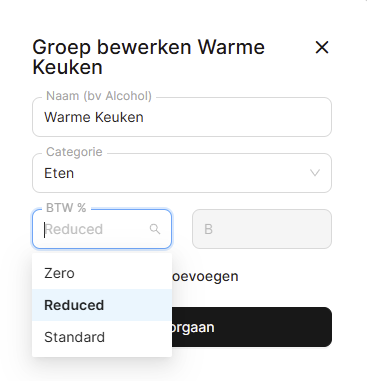 Nadat je een nieuw BTW-niveau hebt aangemaakt, kun je dit toewijzen aan een specifieke Groep. Elk Artikel binnen deze groep wordt verkocht met het BTW-niveau dat je eerder hebt ingesteld.