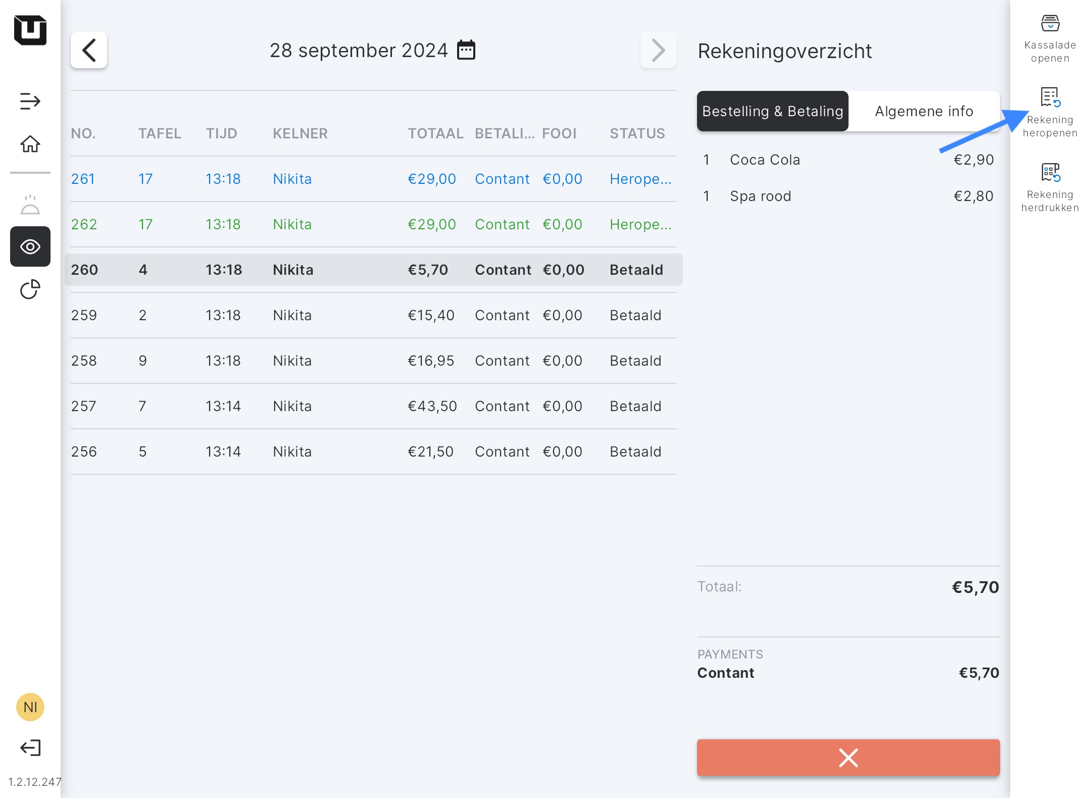 Met de functie Bestelling heropenen kun je de eerder betaalde bestelling heropenen om alle nodige aanpassingen te doen, zoals kortingen toepassen, artikelen annuleren, de rekening splitsen, betaalmethoden wijzigen en meer.