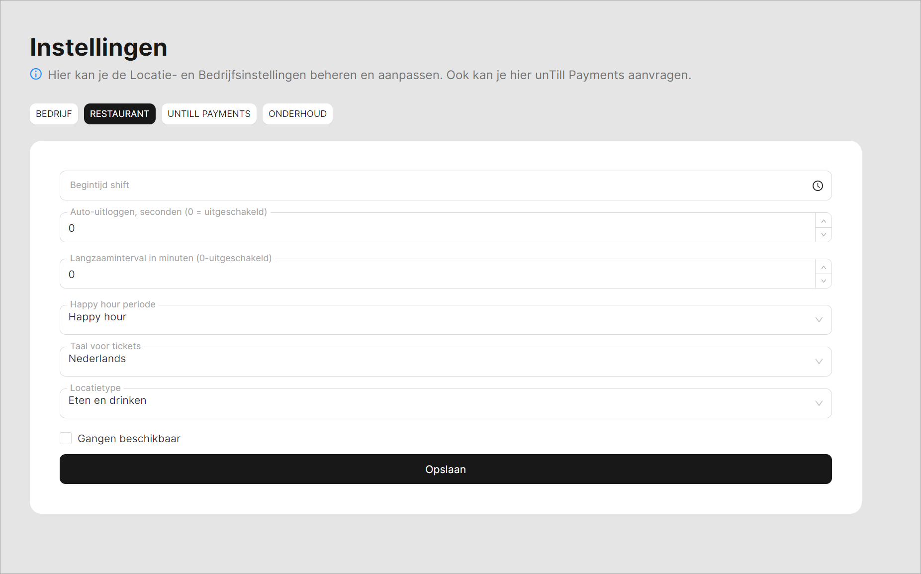 Om meer te weten te komen over deze aanpasbare instellingen, inclusief de starttijd van het werk, de afmeldtijd voor de POS-gebruiker en de periodes van het Happy Hour, raadpleeg deze pagina.