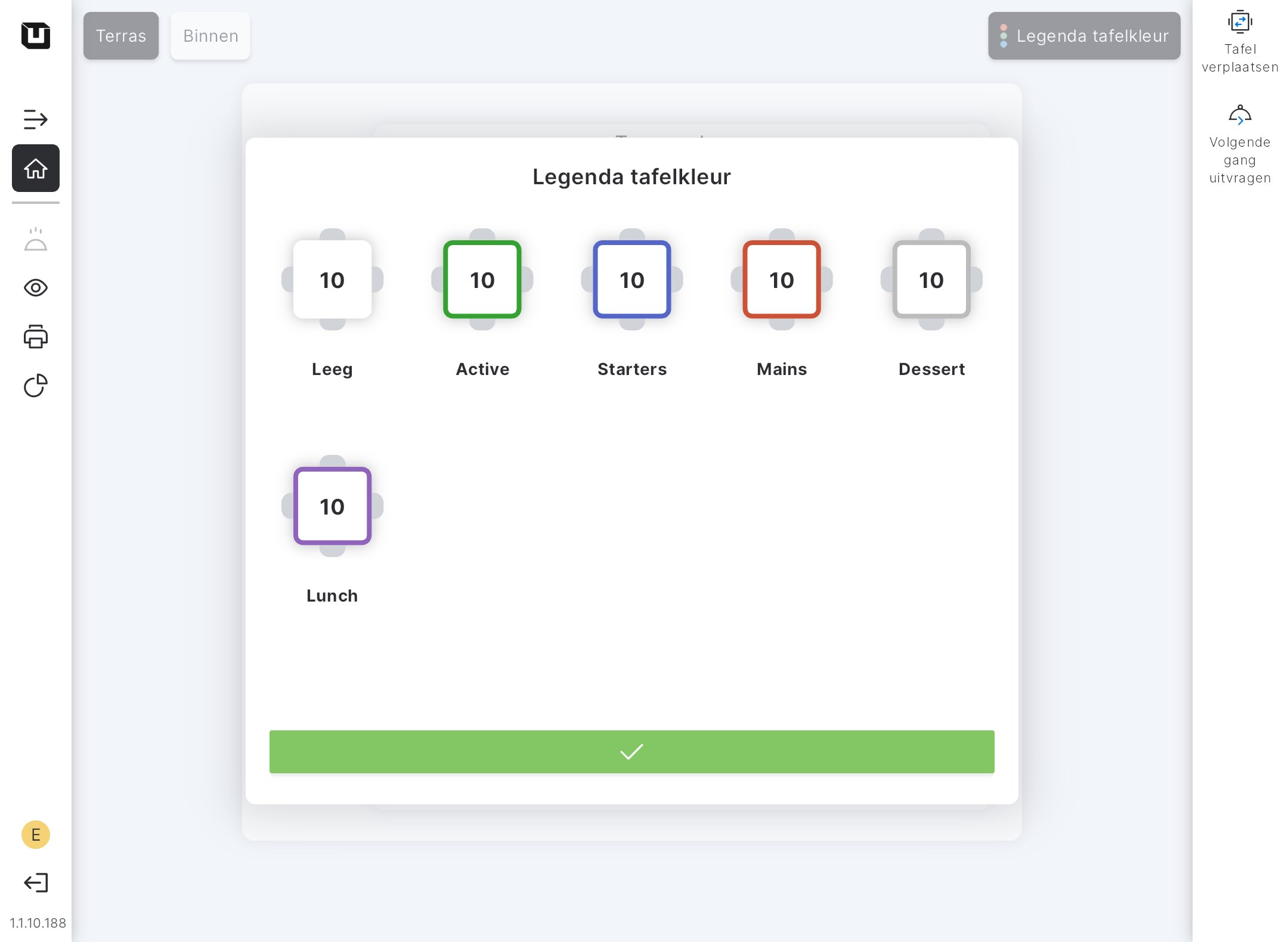 Je kunt zien hoe deze kleuren eruitzien op de 'Tafelkleurlegenda' die zich rechtsboven op de pagina bevindt. De tafelkleurlegenda kan dienen als een herinnering voor de POS-gebruiker over de momenteel actieve Gang.
