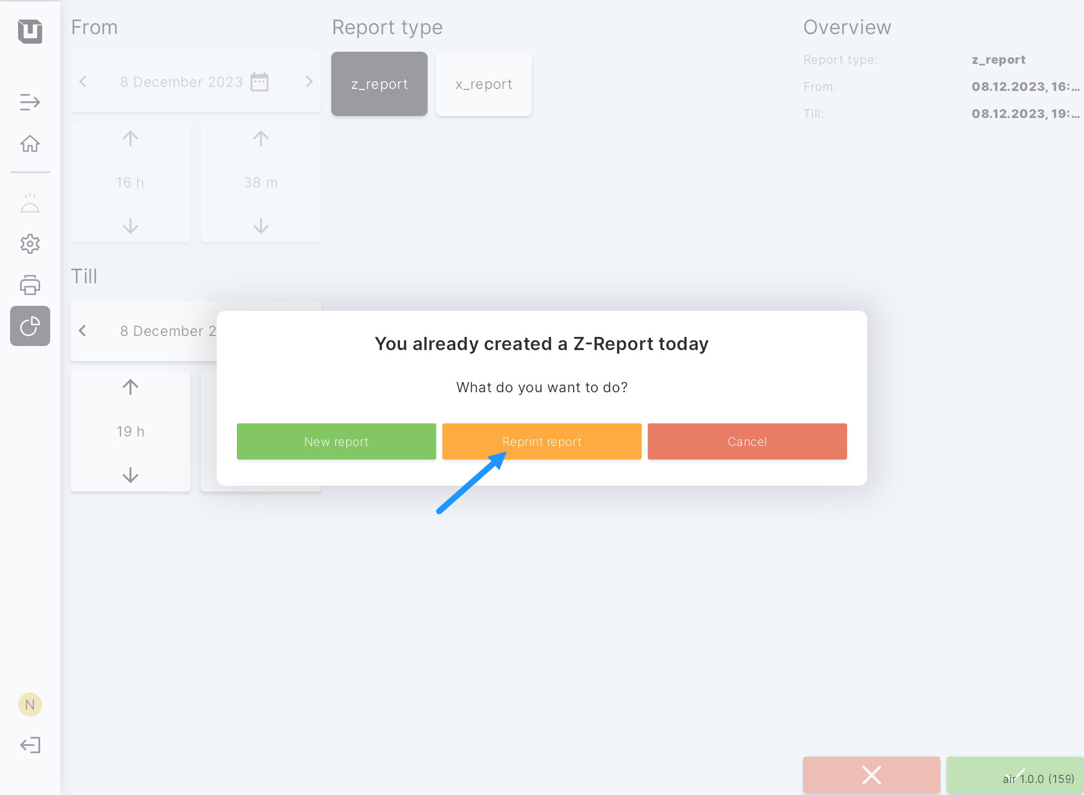 You can reprint the Z report for the same day if you have already created one. In this case, the exact same report will be printed again, covering the same period.