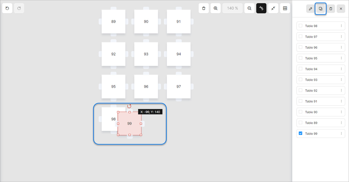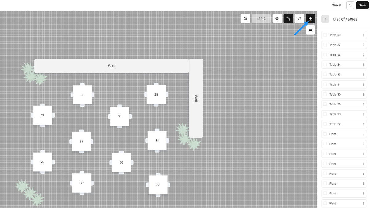 Tip: Je kunt de rasterfunctie gebruiken om tafels te verplaatsen. Klik hiervoor op de knop zoals hieronder getoond.