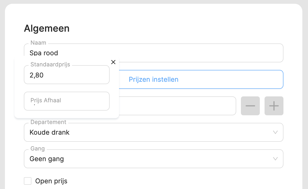 Als je bedrijf bijvoorbeeld verschillende prijzen heeft, afhankelijk van of artikelen binnen of bij het afhaalpunt worden verkocht, kun je dit eenvoudig instellen via de speciale prijs functie. Door deze functie te activeren voor een specifieke ruimte en er prijzen voor in te vullen, kun je ervoor zorgen dat wanneer je scherm wordt toegewezen aan deze ruimte, alle artikelen worden verkocht tegen de prijs die je er specifiek voor hebt bepaald, en deze prijs kan verschillen van de gebruikelijke prijs.