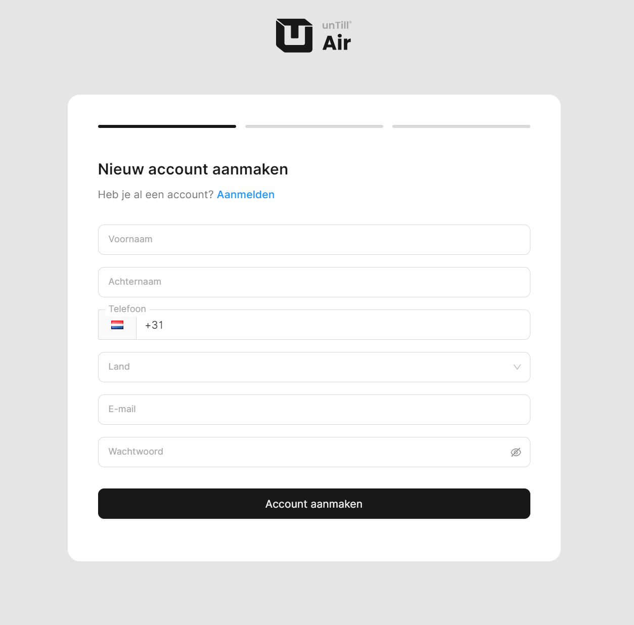 Zodra de link naar air.untill.com die de reseller je heeft gestuurd is geopend, kun je je registreren in het systeem. Nadat dit is gelukt, heb je een account in unTill Air. Zodra de pagina is geopend, zie je het volgende formulier dat moet worden ingevuld:
