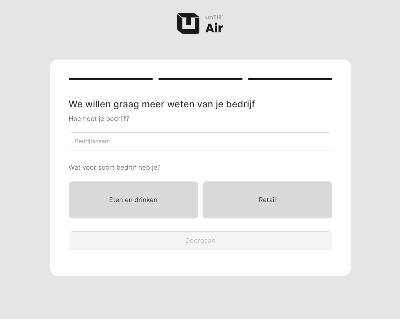 Zodra de bedrijfsinformatie is ingevuld en je op de knop 'Doorgaan' hebt geklikt, wordt je locatie aangemaakt. Er zijn geen verdere stappen nodig om je unTill Air locatie aan te maken en 14 dagen gratis uit te proberen.