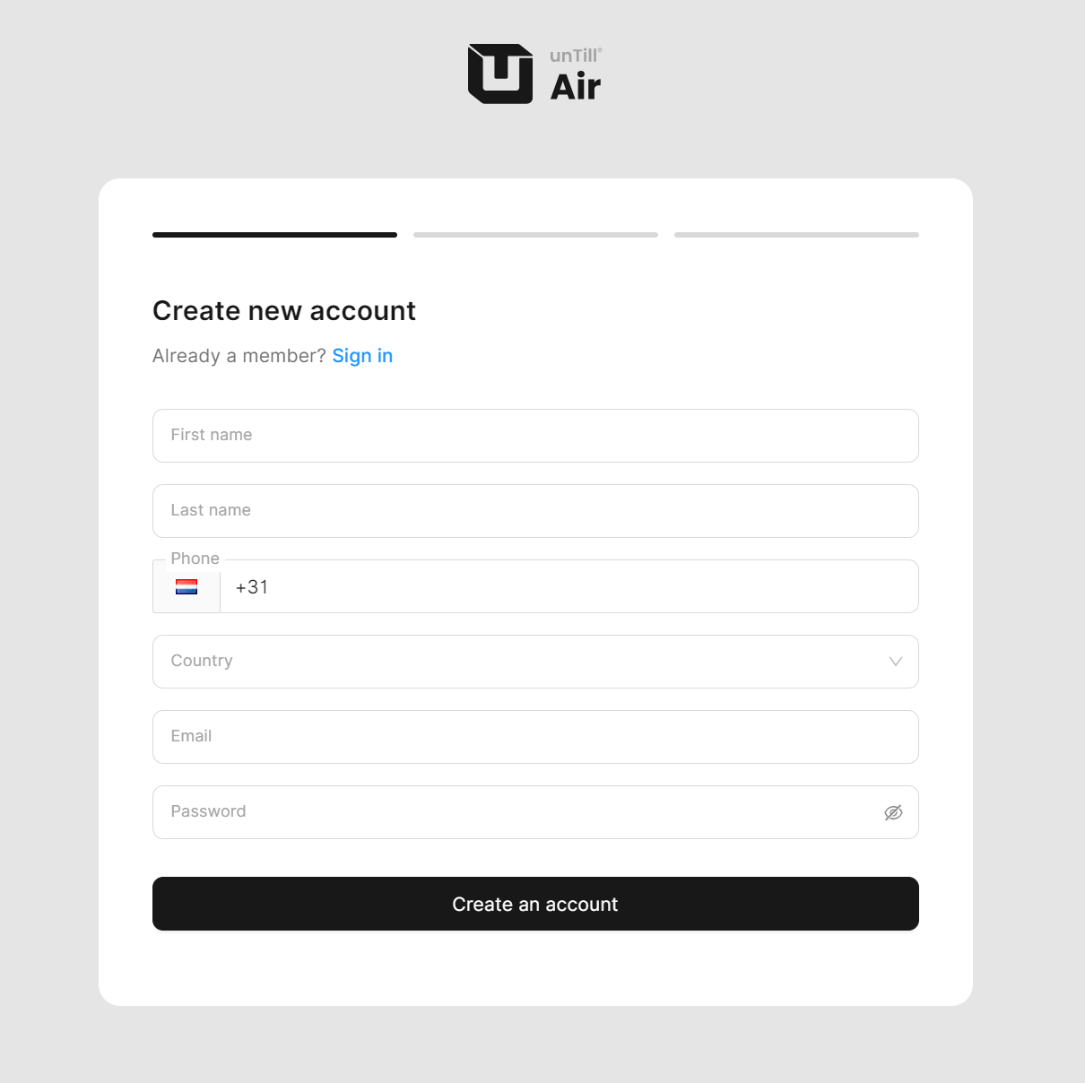 Once the link to air.untill.com that the reseller sent to you is opened, you can register in the system. After it’s done, you will have an account in unTill Air. Once the page is opened, you’ll see the following form that needs to be filled out: